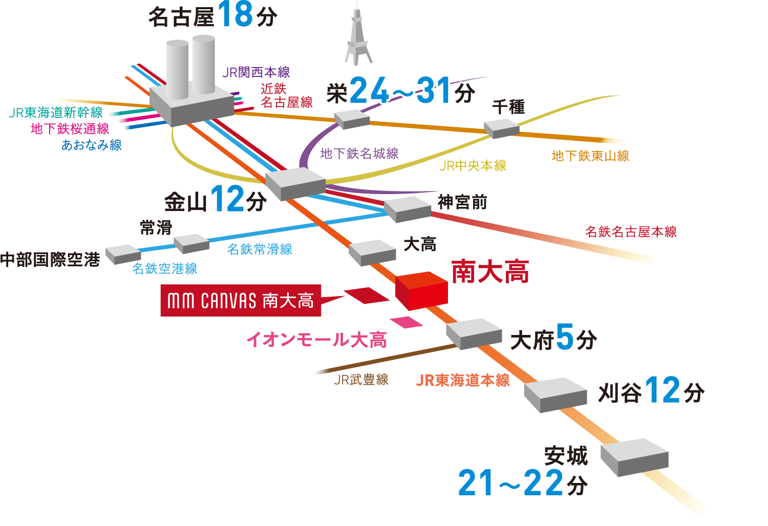また、多くの路線が交差する「金山」駅や「名古屋」駅経由でアクセス網がさらに広がっていきます。